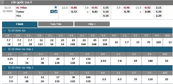 Kể từ năm 2009, Torino thua chung cuộc 9/10 trận làm khách liên tiếp ở Cúp QG Italia. Kể từ đầu thập niên 90 của thế kỷ trước, đội bóng thành Turin này cũng không 1 lần giành chiến thắng tại sào huyệt của AC Milan. 4/5 trận sân nhà gần nhất sắm vai cửa trên, AC Milan ca khúc khải hoàn. Chủ nhà thắng kèo cá độ châu Âu, đương nhiên sáng cửa nhất!