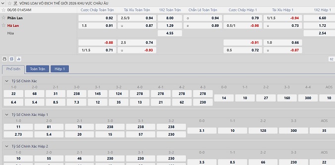 Tỷ lệ kèo Phần Lan vs Hà Lan hôm nay, 1h45 ngày 8/6